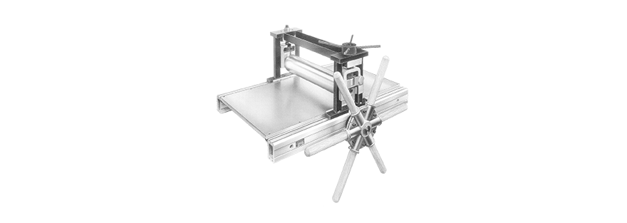 Entwicklung der Kupferdruckpresse Typ DPK: Die Erhöhung des Drucks der Walzen wird neben Härte und Gewicht zusätzilch durch die Erweiterung des Durchmessers erzielt. Kupferstiche, Linol-, Holzschnite und Lithografien werden auf der DPK gedruckt.